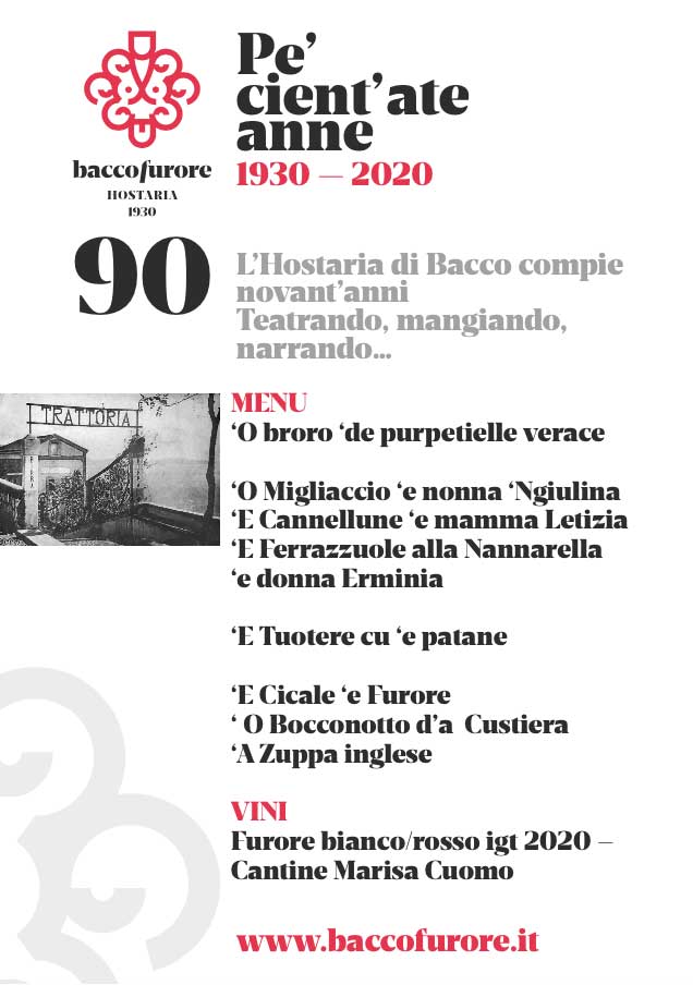 “Pe’ cient’ate anne! Cu ‘na bona ciorta e ‘na bona salute!”. E’ questo il messaggio augurale, rigorosamente in vernacolo, che teniamo a rivolgere all’antica Hostaria di Bacco di Furore, in vista de traguardo dei primi novant’anni di attività.