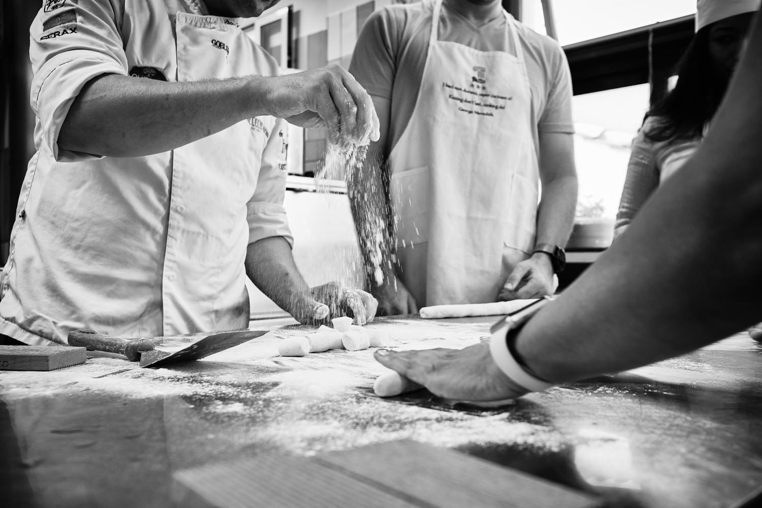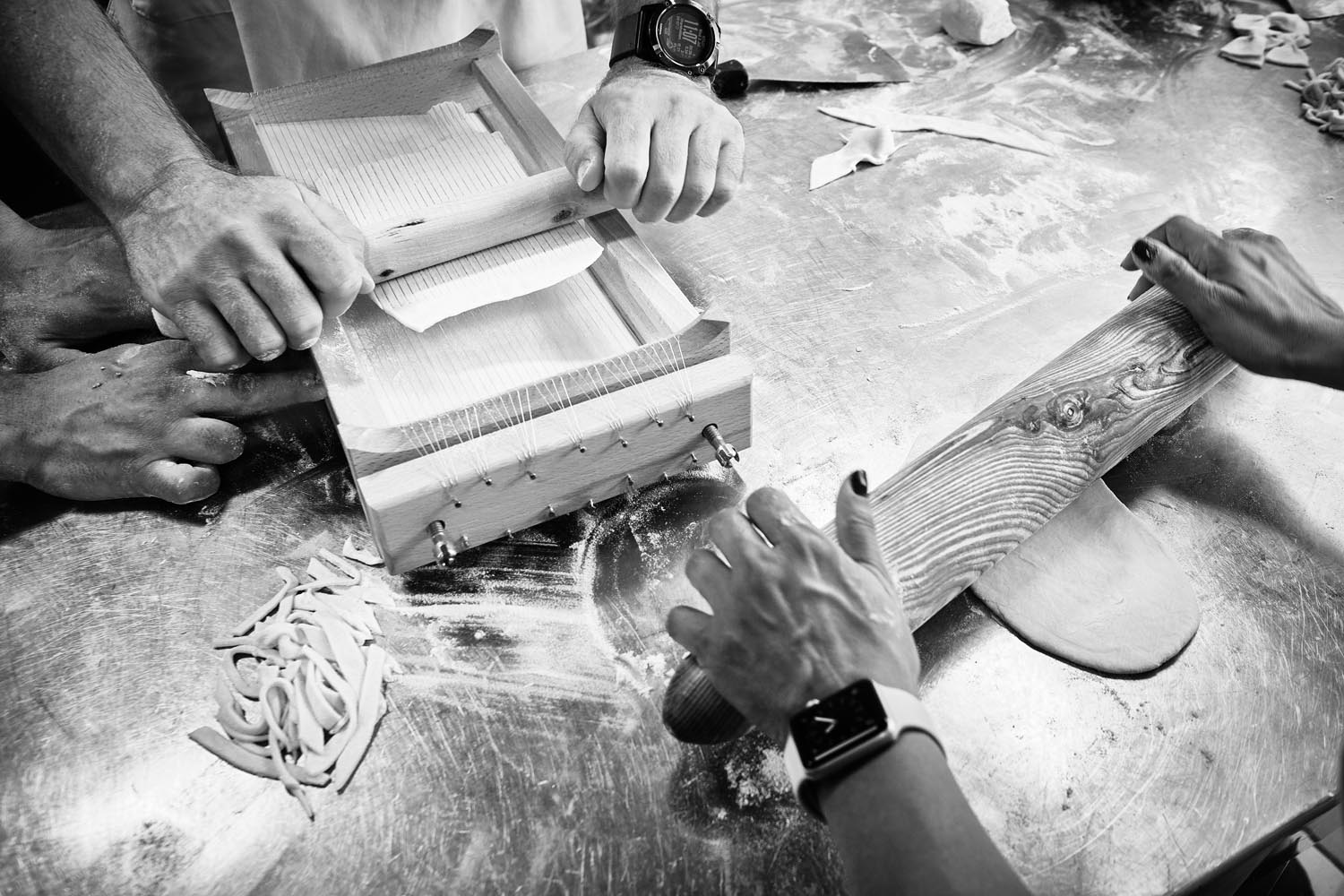 Acqua e farina al Sud, dove il grano duro consente di fare a meno dell’uovo; acqua e farina di grano tenero e uova al Centro-Nord, la pasta mantiene un legame indissolubile con il “terroir” inteso alla francese come “l’insieme delle creazioni, delle pratiche, dei comportamenti e dei valori condivisi da una comunità, riconosciuti come i più rispondenti alle sue esigenze e tramandati di generazione in generazione oralmente, per assimilazione, per imitazione.” A fare la differenza concorrono poi altri elementi di distinzione di tipo naturale quali la qualità dell’acqua, il clima, l’altitudine, la ventilazione e così via. La cucina, per queste ragioni è un patrimonio di identità, un presidio di cultura, un pensiero, un atto d’amore. In sintonia con tali convincimenti abbiamo inteso orientare i nostri corsi di cucina sulla pasta fatta in casa, a mano, come storicamente è stata sempre fatta.